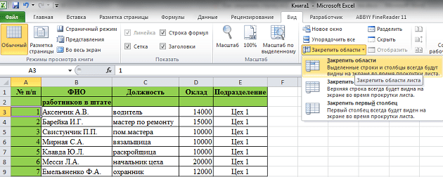 - Поставить курсор в ячейку A2 и кликнуть на «Закрепить области».