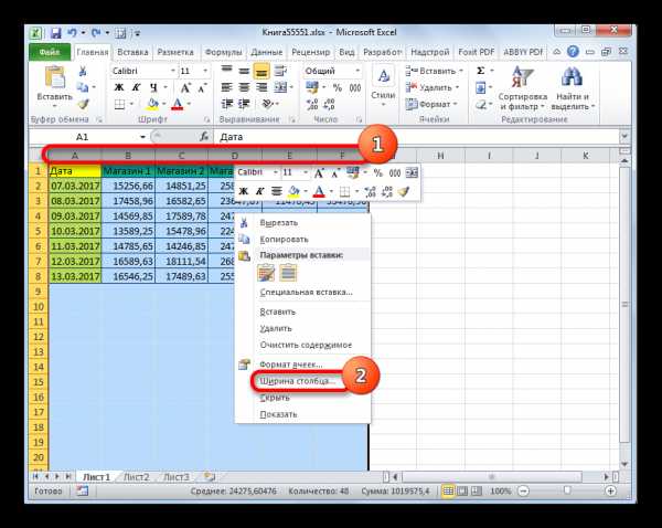- Выделяем колонку или группу столбцов, которые нужно увеличить. Выделение производим таким же образом, как и при предыдущем варианте действий. Затем щелкаем по выделению правой кнопкой мыши. Запускается контекстное меню. Щелкаем в нем по пункту «Ширина столбца…».