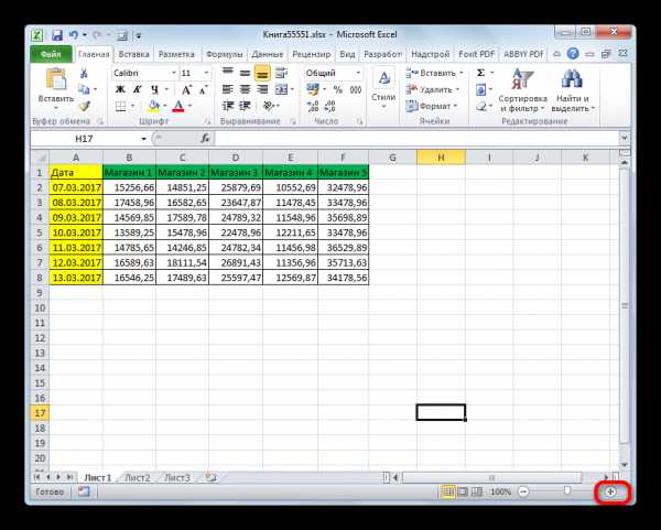 - Для того, чтобы увеличить страницу на экране, нужно передвинуть вправо ползунок масштаба, который находится в нижнем правом углу строки состояния Excel.