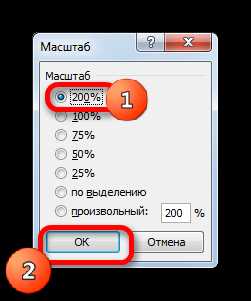 - Открывается окошко, в котором имеются предустановленные варианты изменения масштаба. Но только один из них больше 100%, то есть, установленной по умолчанию величины. Таким образом, выбрав только вариант «200%», мы сможем увеличить размеры таблицы на экране. После выбора следует нажать кнопку «OK».