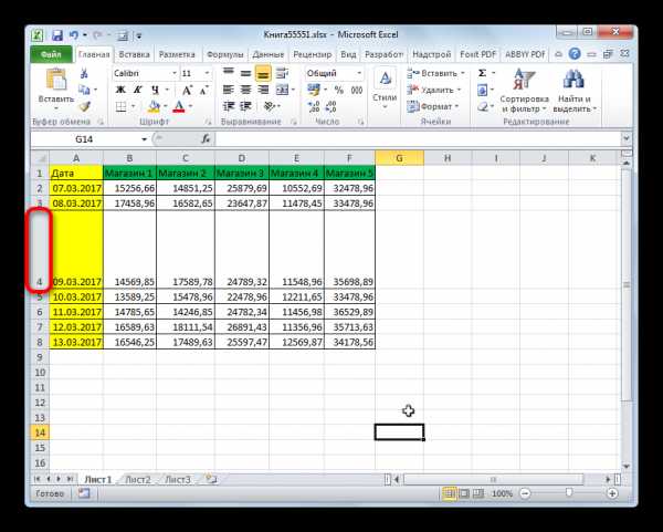 - Как видим, при этом расширилась не только та строка, за границу которой мы тянули, но и все остальные выделенные строки. В конкретно нашем случае все строчки табличного диапазона.