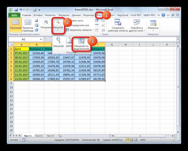 Довольно полезным является инструмент «Масштаб по выделенному», который позволяет увеличить масштаб таблицы ровно настолько, чтобы она полностью вписалась в область окна Excel.