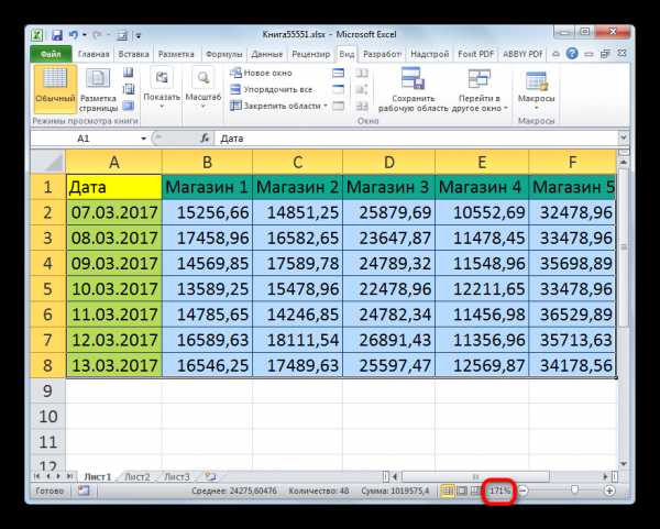 - Как видим, после этого действия таблица была увеличена ровно настолько, чтобы поместиться в окно программы. Теперь в конкретно нашем случае масштаб достиг значения 171%.