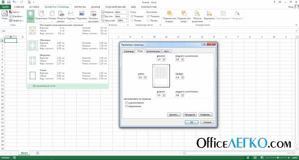 - Вызовите окно «Параметры страницы » и перейдите на вкладку «Поля » для точной настройки. Здесь вы сможете вручную указать размеры левого, правого, верхнего и нижнего полей, а так же, колонтитулы. Здесь же можно отцентрировать рабочую область относительно полей, установив соответствующие галочки (на миниатюре в центре листа будет указано новое положение).
