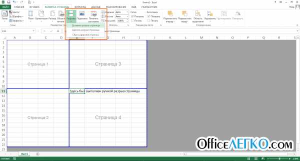 Если вам нужно в каком-то месте листа вставить принудительный разрыв страницы, установите курсор в ячейку справа ниже места разрыва и выполните ленточную команду Разметка страницы – Параметры страницы – Разрывы – Вставить разрыв страницы . Например, чтобы вставить разрыв после столбца D и строки №10, выделите ячейку E11 и выполняйте приведенную команду.