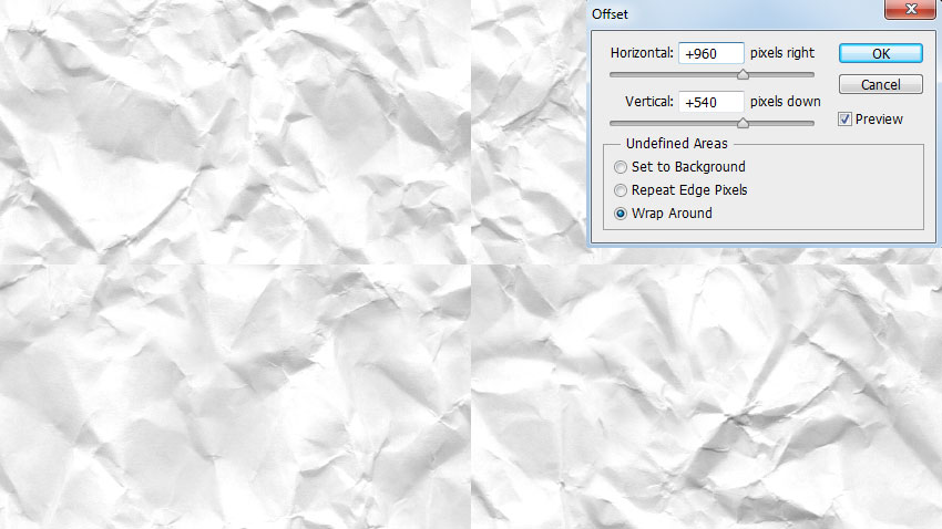 Выбираем Фильтр > Другое > Сдвиг (Filter > Other > Offset) и выставляем значения сдвига ровно половину от значения размера изображения. Также выставляем режим Неопределенных областей (Undefined Areas) – Вставить отсеченные фрагменты (Wrap Around).