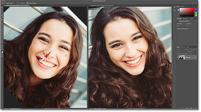 Недостаток выбора инструмента «Рука» с помощью нажатия клавиши Н заключается в том, что этот инструмент остается активным до тех пор, пока не будет выбран другой инструмент на панели инструментов. Однако мы можем временно включить инструмент «Рука», просто нажав и удержав клавишу «пробел» (spacebar) на клавиатуре. При нажатой клавише «пробел» кликните на изображении и потяните его для прокрутки внутри окна документа, затем отпустите клавишу, чтобы предыдущий инструмент вновь стал активным: