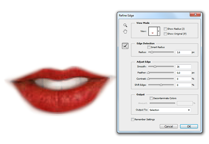 После выделения желательно настроить параметры края через вкладку «Уточнить край» вверху.