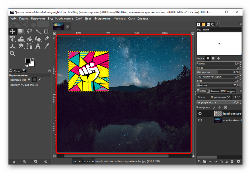 4. Примените инструмент «Перемещение» и расположите объект в нужной для вас области картинки.
