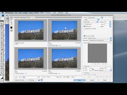 Открыв фотографию в Photoshop, выберите «Сохранить для Интернета» в меню «Файл». Получившееся окно имеет четыре вкладки чуть выше предварительного просмотра изображения. Перейдите на вкладку «Четверо». Теперь в раскрывающемся меню «Настройки» справа выберите «JPEG High».