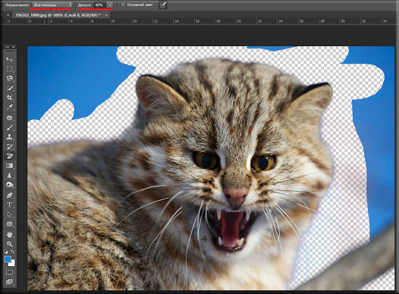 - В верху поставьте ограничение «Все пиксели». Допуск поставьте 45%. А вот сейчас выберете размер ластика 60-70 и начинайте стирать небо. Не опасайтесь проехаться по котику, поскольку ему ничего не будет. Так как вы выбрали отправной точкой как раз кусочек светло синий неба, соответственно он и будет стирать лишь данный его оттенки и цвет. Как видите, отечественный кот не затронулся, а фон около него провалился сквозь землю.