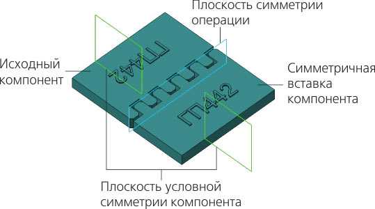 Симметрия компонента может быть принята условно (например, на его теле может быть гравировка). Если исходный компонент является условно симметричным, то в модель добавляется симметричная вставка этого компонента относительно указанной плоскости симметрии (рис. 7).