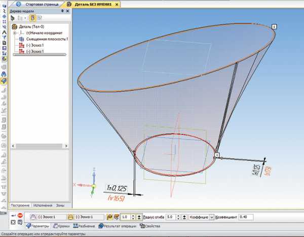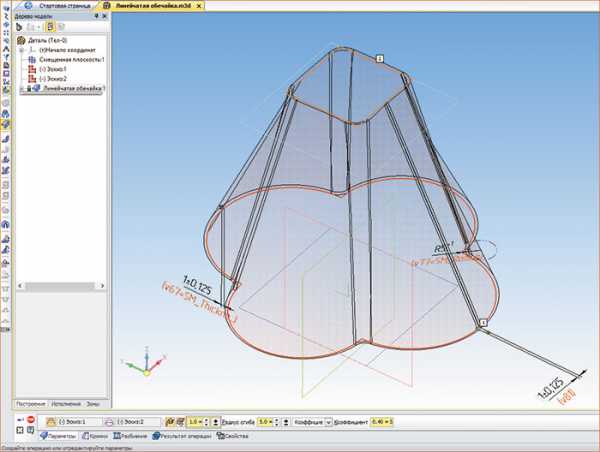 Большое внимание в КОМПАС3D V16 уделено листовым телам. Можно сказать, что в V16 операция гибки получила вторую жизнь. Появилась возможность моделировать линейчатые обечайки и получать их развертки. Линейчатая обечайка отличается от простой обечайки тем, что создается по двум эскизам, которые могут существенно различаться геометрически (рис. 10). Такая обечайка основывается на линейчатой поверхности общего вида и не всегда является физически разворачиваемой без пластической деформации. Если раньше пользователь был вынужден строить подобные детали с помощью поверхностей и твердотельных операций без возможности построить развертку, то в V16 все становится гораздо проще.