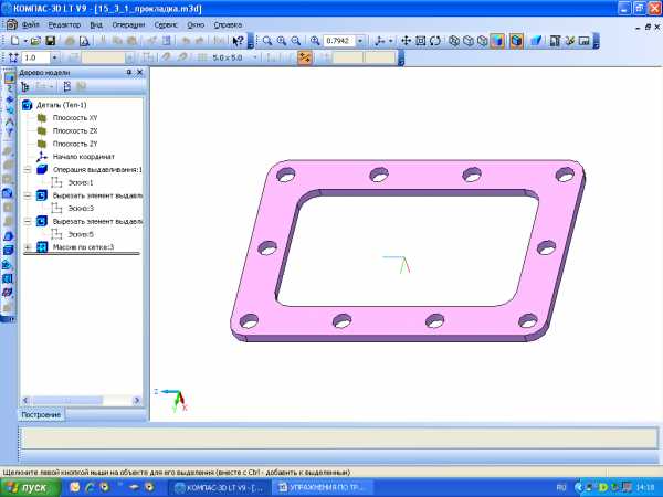 Эскиз 3 – окружность диаметром 10 мм с центром в точке пересечения средних линий – вырежьтечерез всю деталь,