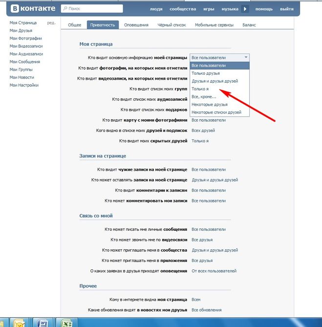 В самом верху экрана нам предоставлен раздел «Моя страница». Чтоб настроить приватность основной информации нажимаем на «Все пользователи» или другое слово, находящееся напротив данной строки. Далее выбираем один из предложенных вариантов. Можно открыть доступ всем пользователям, или только друзьям, также есть вариант – друзья и друзья друзей. Можно открыть доступ только себе. Кроме этого, можно вручную выбрать некоторых друзей или открыть доступ всем, кроме конкретных личностей (таким образом можно ограничить доступ в вк другу), также есть вариант выбрать некоторые списки. Выбирая одну из предложенных строк, вы определяете уровень своей приватности, скрытости основной информации от других глаз.