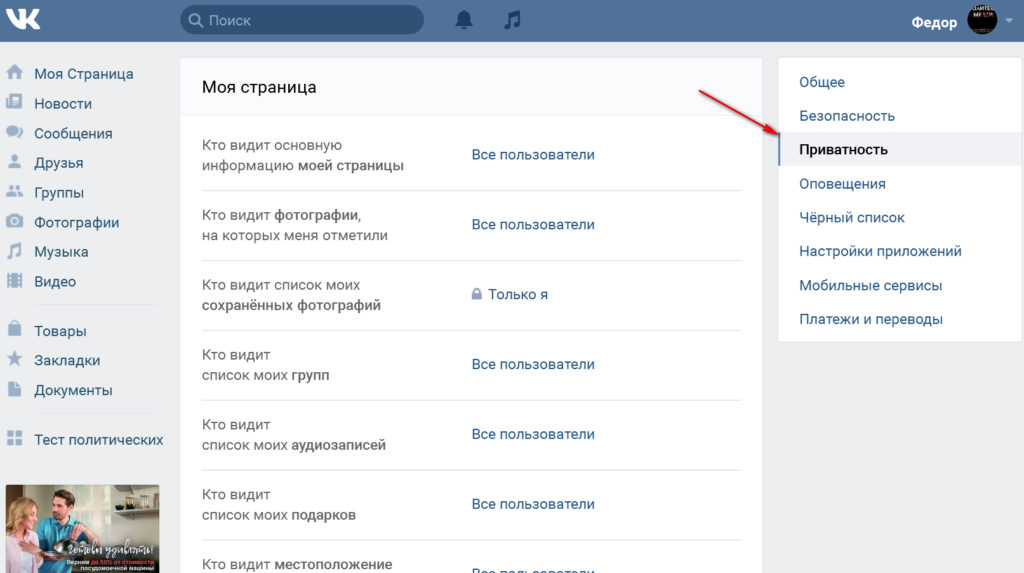 В открывшемся окне выбираем вкладку «Приватность», которая находится в правой стороне интерфейса.