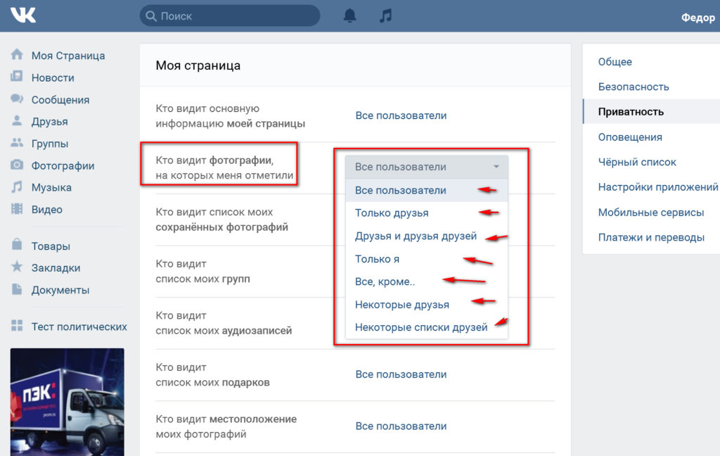Настраиваем приватность данного раздела, выбираем доступность к снимкам, на которых стоит отметка, список сохраненных фото, видимость списка моих групп, список аудиозаписей, список подарков.