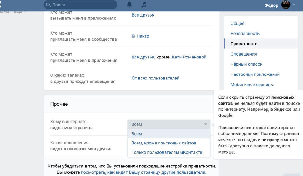 Помните о том, что информацией, которая находится на вашей странице в открытом доступе, могут в плохих целях воспользоваться другие пользователи, в частности всевозможные мошенники. Поэтому не пренебрегайте настройками своей приватности.