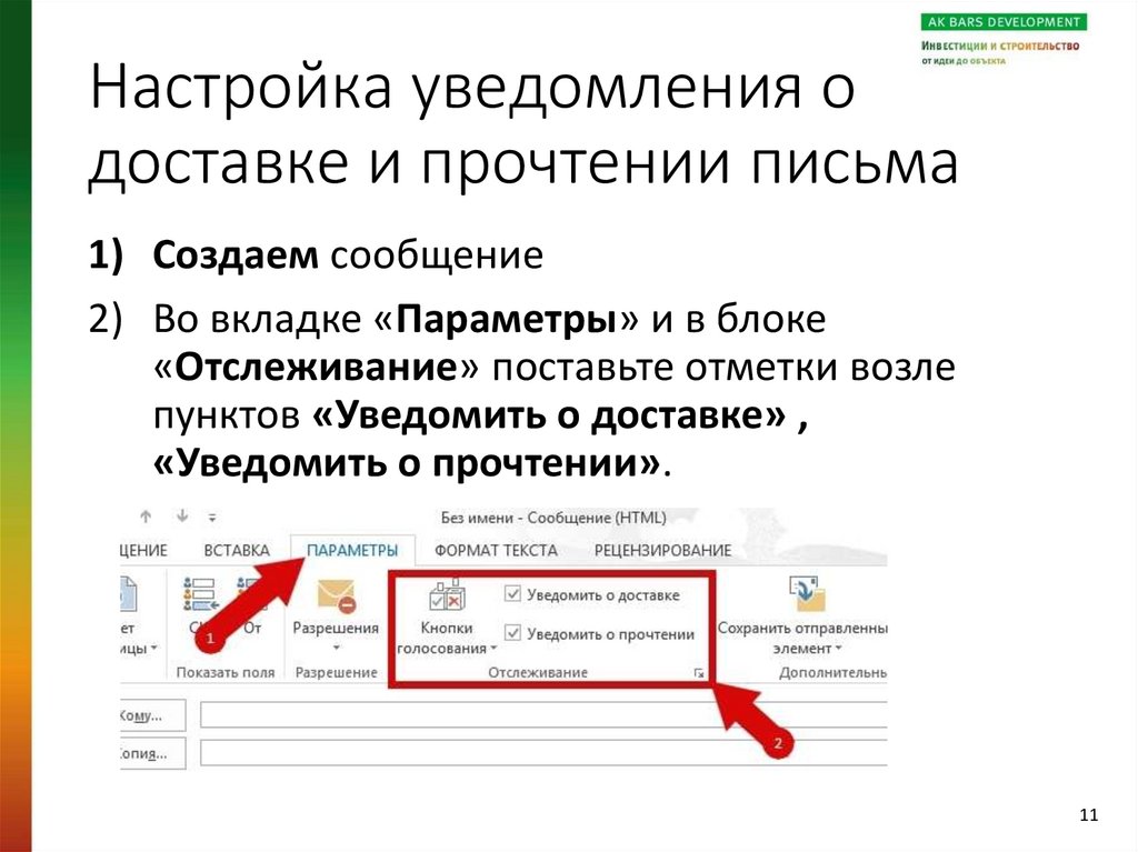 Установите флажок уведомление о прочтении или уведомление о доставке .