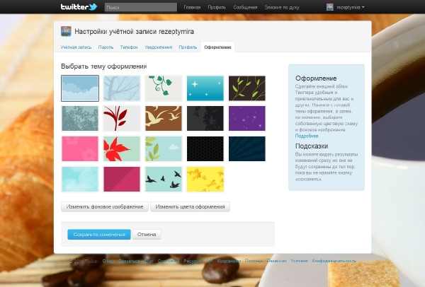 : взять новые обои из списка стандартных, загрузить свои, сделать одну картинку на весь экран или замостить. Открыв страничку в Твиттере (правый верхний угол), заходим в «Настройки» и выбираем фон во вкладке «Оформление». Там их не один десяток. Выбрав, изменения сохраняют. Если из базового перечня ничего не понравилось — можно загрузить свою картинку.