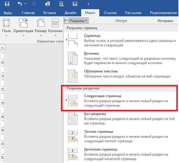 Вставить разрыв раздела в Microsoft WordЕсть четыре типа разрывов секций: