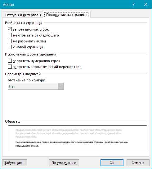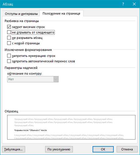 Перейдите во вкладку «Макет» и в группе «Абзац» разверните соответствующее диалоговое окно, переключившись на вкладку «Положение на странице».