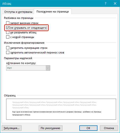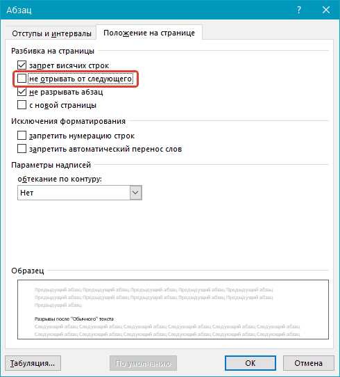 3. Во вкладке «Положение на странице» снимите галочку с параметра «Не отрывать от следующего».