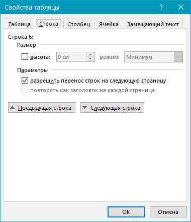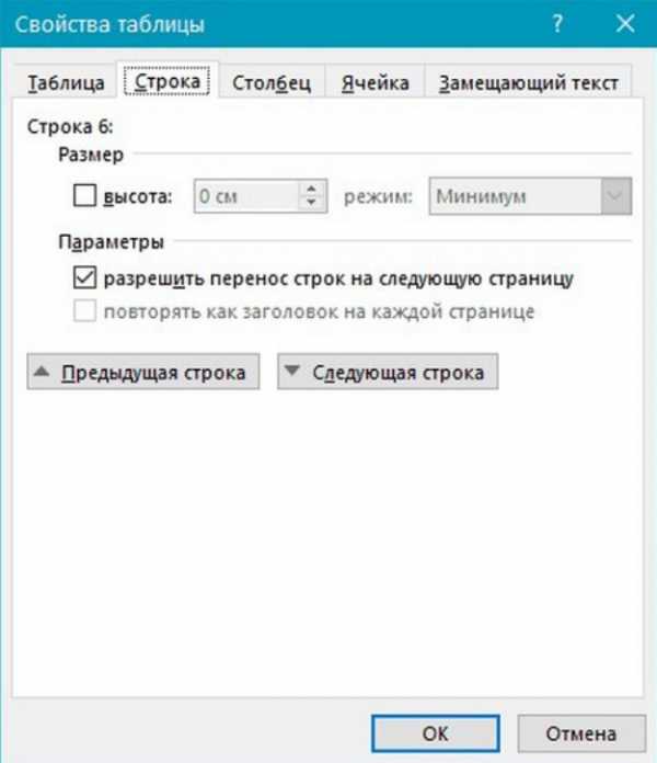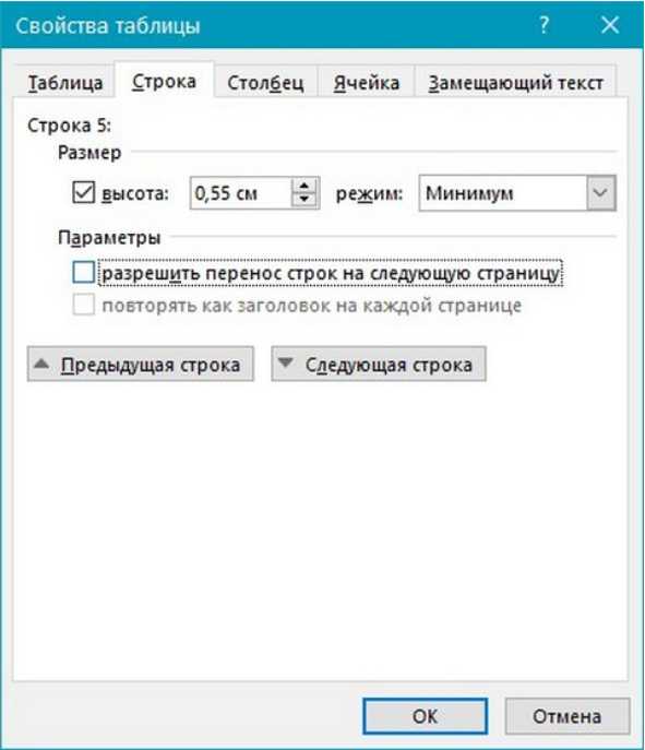 Здесь необходимо «разрешить перенос строк на следующую страницу», установив соответствующую галочку. Данный параметр задает разрыв страницы для всей таблицы.