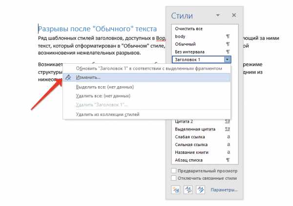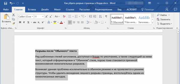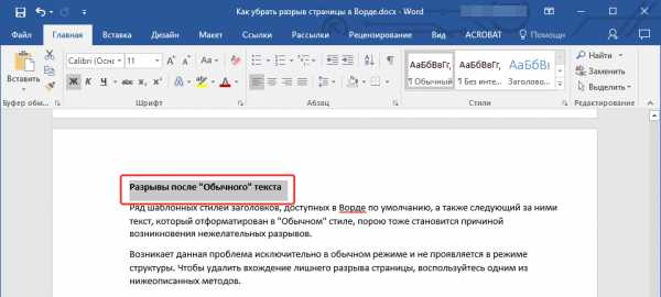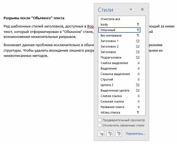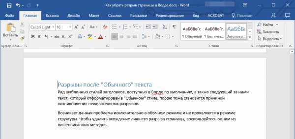 Ряд шаблонных стилей заголовков, доступных в Ворде по умолчанию, а также следующий за ними текст, который отформатирован в «Обычном» стиле, иногда тоже становится причиной возникновения нежелательных разрывов.