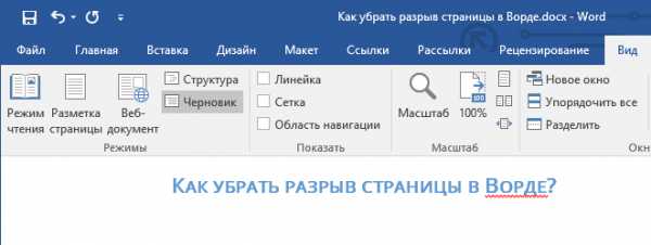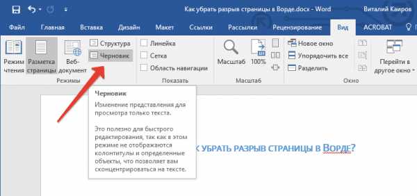 Примечание: Просматривать разрывы страниц в режиме «Разметка страницы» неудобно, лучше для этого переключиться в режим черновика. Для этого откройте вкладку «Вид» и выберите «Черновик»