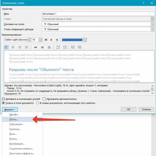 4. В появившемся окне нажмите на кнопку «Формат», расположенную снизу слева, и выберите пункт «Абзац».