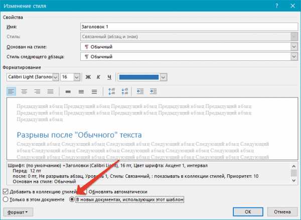 7. Для того, чтобы внесенные вами изменения стали постоянными для текущего документа, а также для последующих документов, создаваемых на основе активного шаблона, в окне «Изменение стиля» установите флажок напротив пункта «В новых документах использующих этот шаблон». Если же вы этого не сделаете, внесенные вами изменения будут применены только к текущему фрагменту текста.