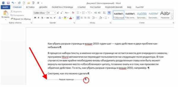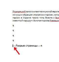 После нажатия на кнопку «Отобразить все символы» в тексте начнут отображаться все непечатаемые символы. Теперь вам нужно найти ненужный вам разрыв страницы и установить перед ним курсор (как на скриншоте внизу). После этого разрыв страницы можно удалить простым нажатием на клавишу DELETE на клавиатуре.