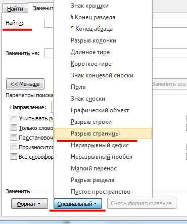 - Устанавливаем курсор в поле с функцией «Найти», кликаем по клавише «Специальный» и из появившегося перечня выбираем пункт «Разрыв странички». В поле будет отображен символ обозначения.