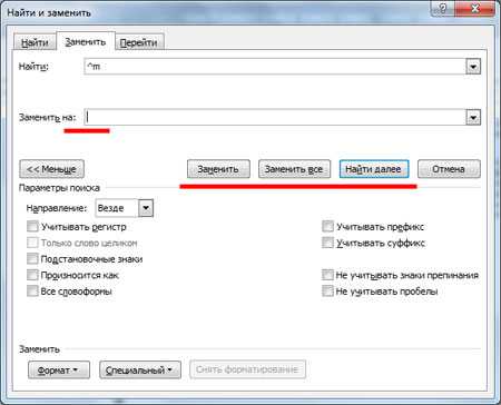 Если вдруг не требуется устранять абсолютно все имеющиеся разрывы, можно кликать по кнопке «Найти далее», и когда будет выделен знак, который не нужен, кликните «Заменить». Таким образом просмотрите весь документ.