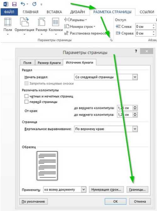 Первым делом необходимо выделить весь документ. Делается это или мышкой, зажав правую клавишу, или через команду меню «Выделить все», или нажав комбинацию клавиш CTRL+A. Далее открываем окно «параметры страницы», где необходимо перейти во вкладку «источник бумаги», а здесь выбираем «границы».
