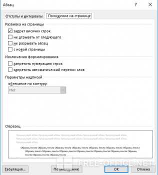 - Дабы не было разрывов страниц в середине абзацев, отметьте галочку «Не разрывать абзац».