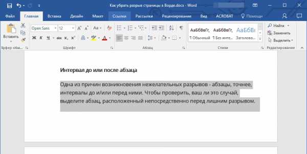 Одна из причин возникновения нежелательных разрывов — абзацы, точнее, интервалы до и/или после них. Чтобы проверить, ваш ли это случай, выделите абзац, расположенный непосредственно перед лишним разрывом.