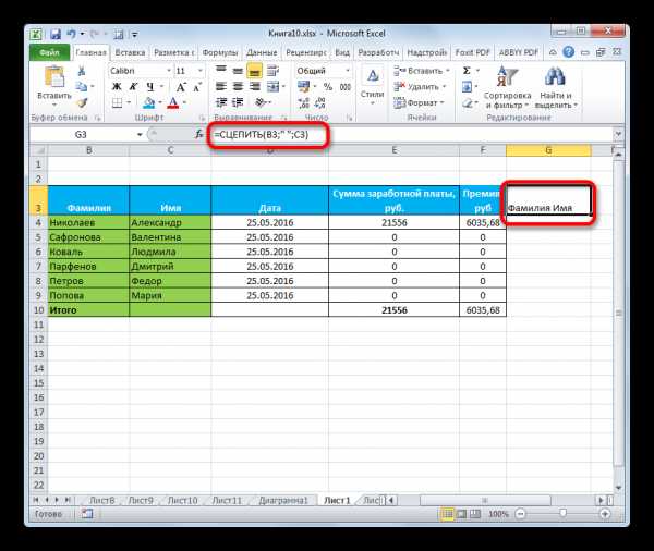 =СЦЕПИТЬ(B3;" ";C3)Как видим, между словами появляется пробел, и они больше не являются слипшимися. При желании вместе с пробелом можно поставить запятую или любой другой разделитель.