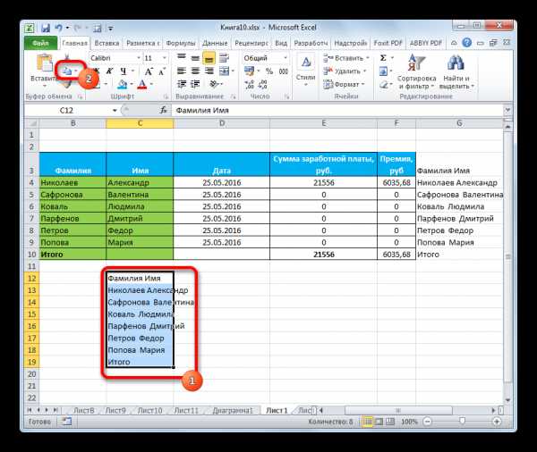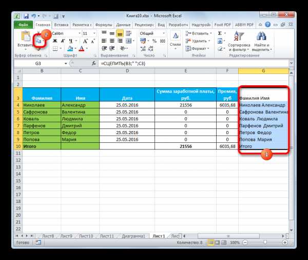 - Как видим, формула скопирована на диапазон ниже, а соответствующие результаты отобразились в ячейках. Но мы просто вынесли значения в отдельный столбец. Теперь же нужно объединить первоначальные ячейки и вернуть данные в изначальное место расположения. Если просто объединить или удалить исходные столбцы, то формула СЦЕПИТЬ будет нарушена, и мы все равно утратим данные. Поэтому поступим немного по-другому. Выделяем колонку с объединенным результатом. Во вкладке «Главная» жмем на кнопку «Копировать», размещенную на ленте в блоке инструментов «Буфер обмена». Как альтернативное действие, можно после выделения столбца набрать на клавиатуре сочетание клавиш Ctrl+C.