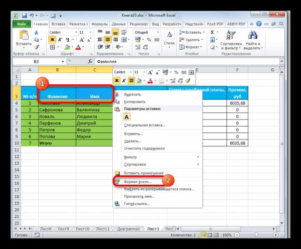 - Выделяем первый сверху ряд ячеек колонок, которые мы хотим объединить. Кликаем по выделенным элементам правой кнопкой мыши. Открывается контекстное меню. Выбираем в нем пункт «Формат ячеек…».