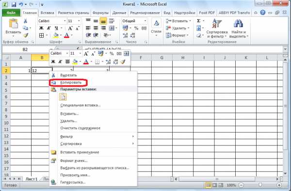 Но, теперь вместо одной объединённой ячейки мы имеем три: две ячейки с первоначальными данными, и одну объединенную. Чтобы сделать одну ячейку, кликаем по объединенной ячейке правой кнопкой мыши, и в контекстном меню выбираем пункт «Копировать».