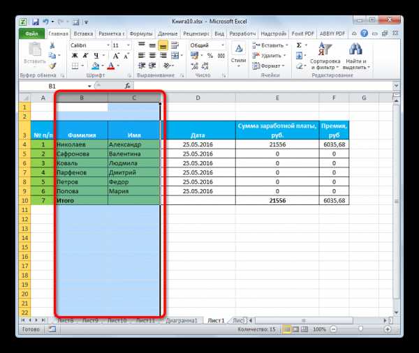 Теперь, удаляем крайний левый столбец, содержащий ячейку с первичными данными, и столбец, содержащий ячейку с формулой сцепления.