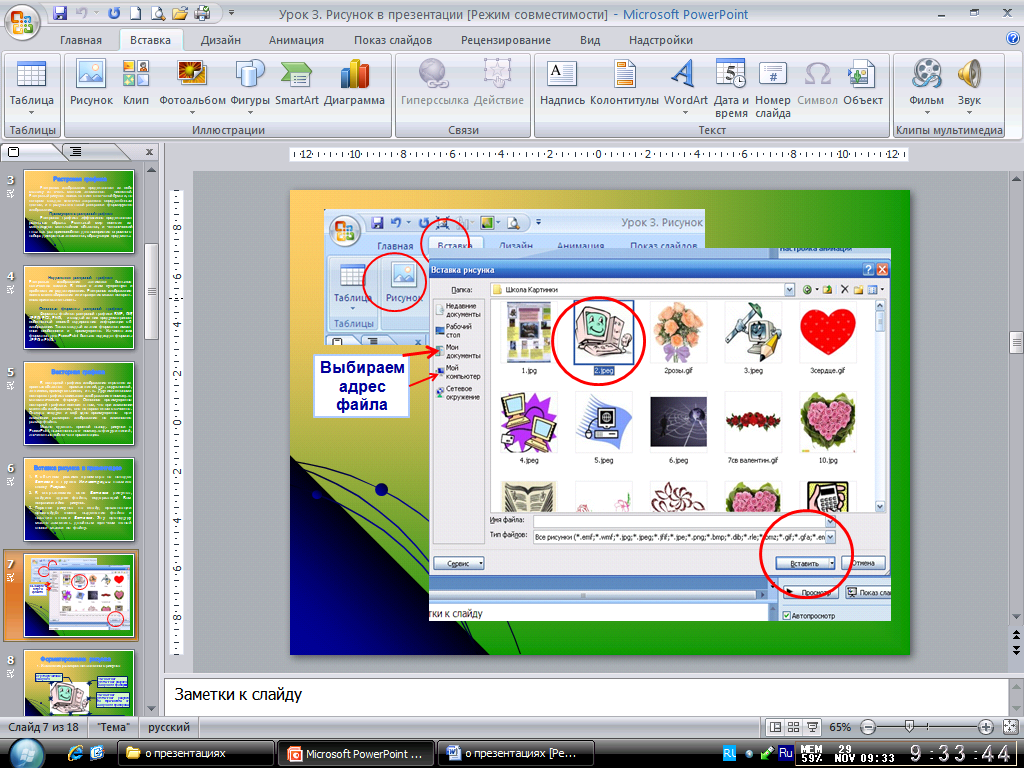 - в списке слайдов слева выберите тот слайд, на который требуется добавить изображение,