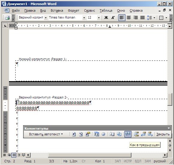 Верхний и нижний колонтитулы в старой версии MS Word:
