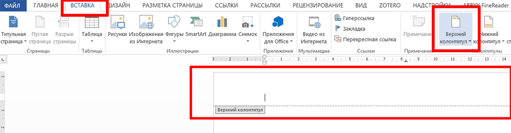Для этого необходимо просто перейти в меню «Вставка» и выбрать тип колонтитула (верхний или нижний).
