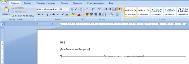 Примечание: Просмотр документа в режиме черновика заметно упрощает визуальный поиск и просмотр разрывов разделов, делая их более наглядными.