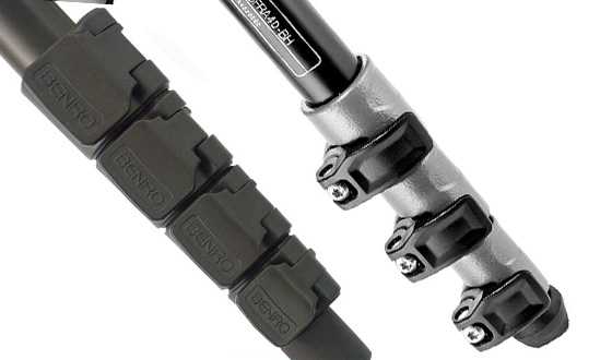 Штативные ноги обычно бывают двух видов – трубчатые и нетрубчатые. Все карбоновые ноги – трубчатые и оснащаются резьбовым замком, в то время как алюминиевые, базальтовые и стальные штативы могут быть как трубчатыми, так и нетрубчатыми, и оснащаются клипсовыми замками. В зависимости от максимальной высоты ноги штатива могут состоять из 3-5 секций. При этом, чем больше секций – тем выше штатив и, как правило, чуть менее устойчив.