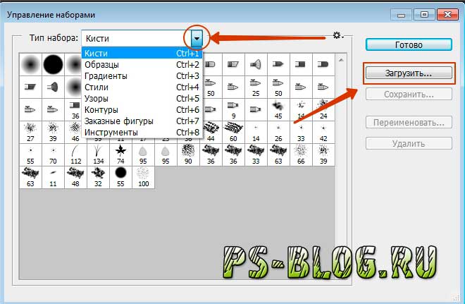 В окне «Управление наборами » (Preset Manager) выбираем «Тип набора » (Preset Type) — «Кисти » (Brushes) и нажимаем «Загрузить » (Load).