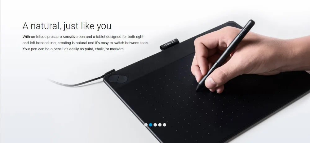 S — Small / Малые, рабочая поверхность 15,75 x 9,84 см, М — Medium / Средние, рабочая поверхность 22,35 x 13,97 см, L – Large / Большие, рабочая поверхность 32,51 x 20,32 см, ХL – Extra Large / Сверхбольшие, рабочая поверхность 46,2 x 30,48 см. При разработке этих устройств, ставилась задача обеспечить максимальный комфорт в работе за счет воссоздания эффекта движения реальной кисти по холсту. Чувствительность к нажиму здесь составляет 2048 уровней, что позволяет управлять диаметром кисти в Photoshоp в очень широких пределах, не отвлекаясь на выбор настроек и нажатие дополнительных клавиш. При длительной работе с легким чувствительным пером, рука заметно меньше устает.
